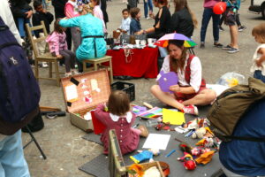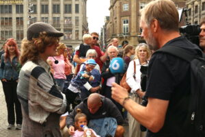 Er was een grote foam vloer gelegd midden op de Dam zodat kinderen konden, tekenen, kleuren maar bovenal zelf poppen konden maken. Het was bijzonder druk en dat betekende veel werk voor de twee ingeplande vrijwilligers Biserka Suran en Nina Karim van Oort. Gelukkig heeft Sol Miranda zich bij hen gevoegd een jonge poppenkastspeler die zich op het laatst nog als vrijwilliger heeft gemeld.